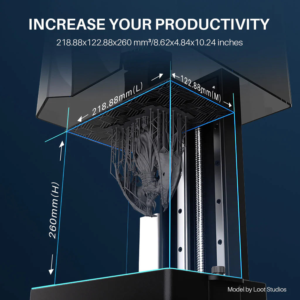 - Un generoso tamaño de construcción de 218,88 × 122,88 × 260 mm³ le permite imprimir modelos más grandes o varias piezas simultáneamente, lo que mejora la productividad.
